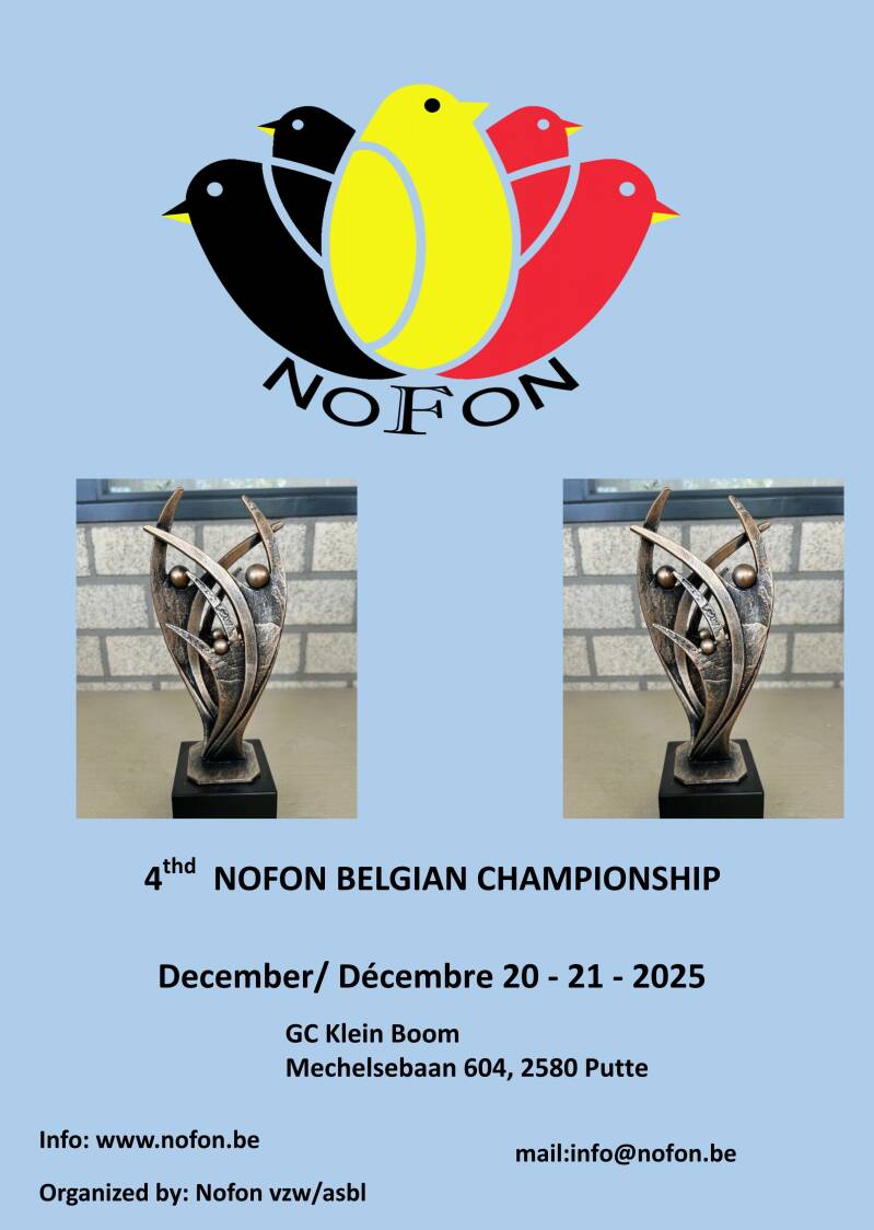Les 20 et 21 décembre 2025, le 4e Championnat de Belgique NOFON se tiendra au GC Klein Boom, Mechelbaan 604, 2580 Putte. Il s'agit d'une exposition d'oiseaux colorés, d'ornement et chant.